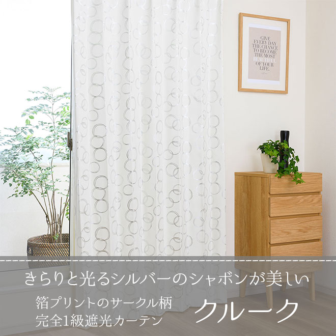 きらりと上品に光るシャボンのようなシルバーのサークル柄がプリントされた完全1級遮光カーテンです。箔プリントならではの高級感がインテリアをワンランクアップしてくれます。