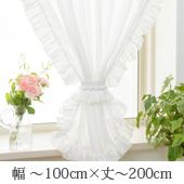 周りをすべてフリルでトリミングしたエレガントな小窓カーテン。窓の幅に対して2倍の生地を使用。ギャザーをたっぷり寄せて上品でおしゃれな窓辺に。