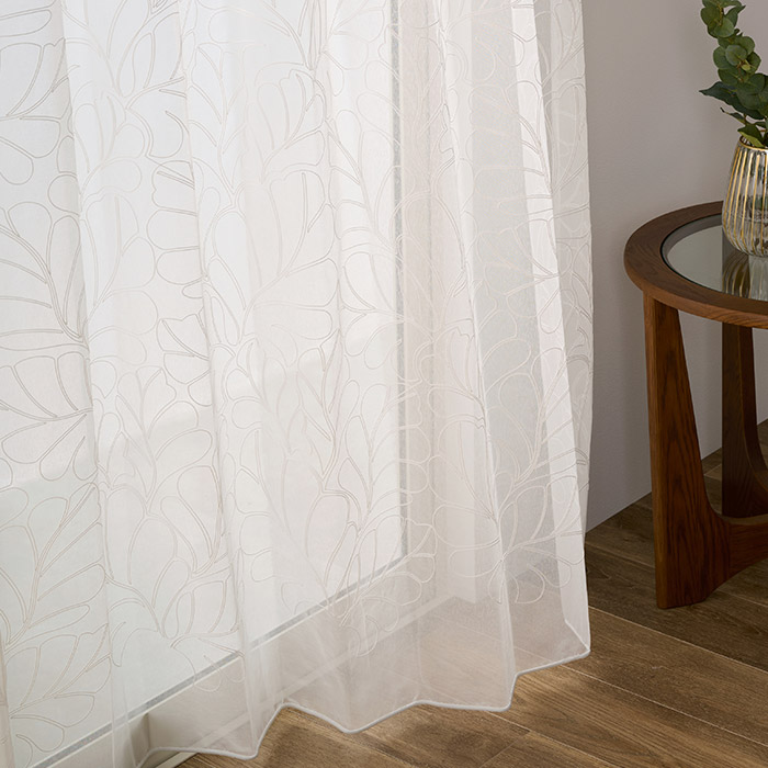程よい透け感があり、柔らかな質感の生地です。繊細に刺繍されたチェーンステッチが美しいレースカーテンです。