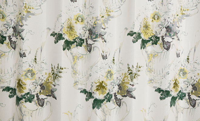花瓶をモチーフにした絵画調の柄の1級遮光カーテン ダーマ(D-1610)生地サンプル