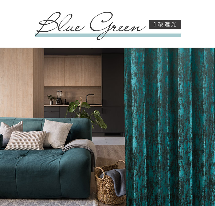 青と緑の間の絶妙な色が美しい「ブルーグリーン」はダーク系でまとめたインテリアと合わせてクールなモダンスタイルに。1級遮光のため寝室・ワークスペースにもおすすめです。