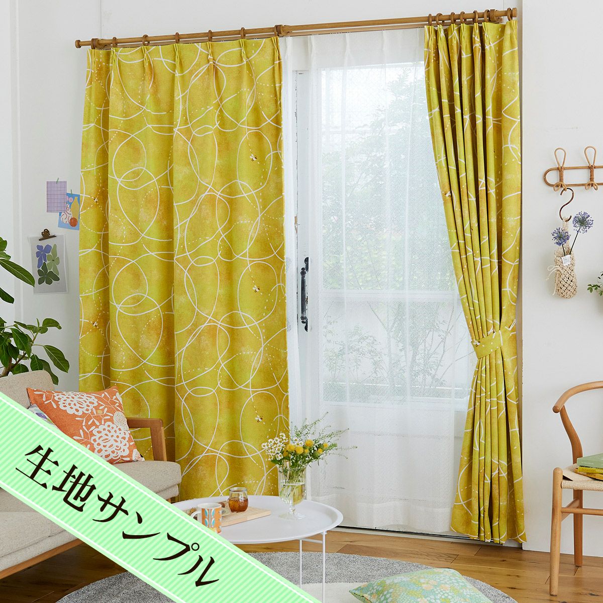 ナチュラルな雰囲気のサークル柄がおしゃれな3級遮光防炎カーテン