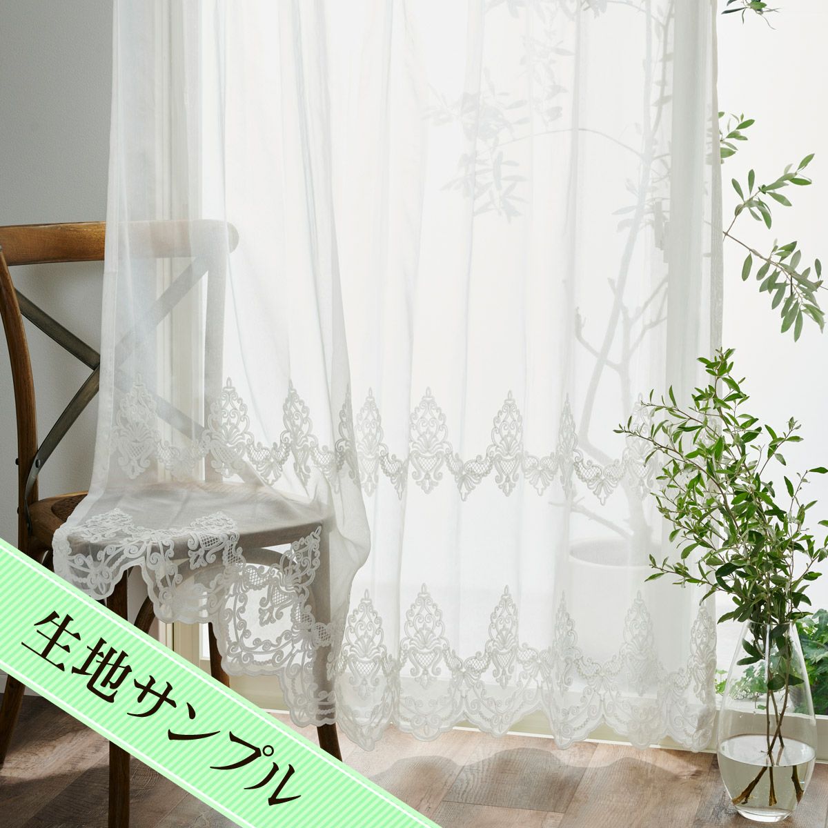 オーナメント模様と小花柄が大人フェミニンでおしゃれなスカラップ刺繍トルコレースカーテン ルシィ(L-8203)生地サンプル