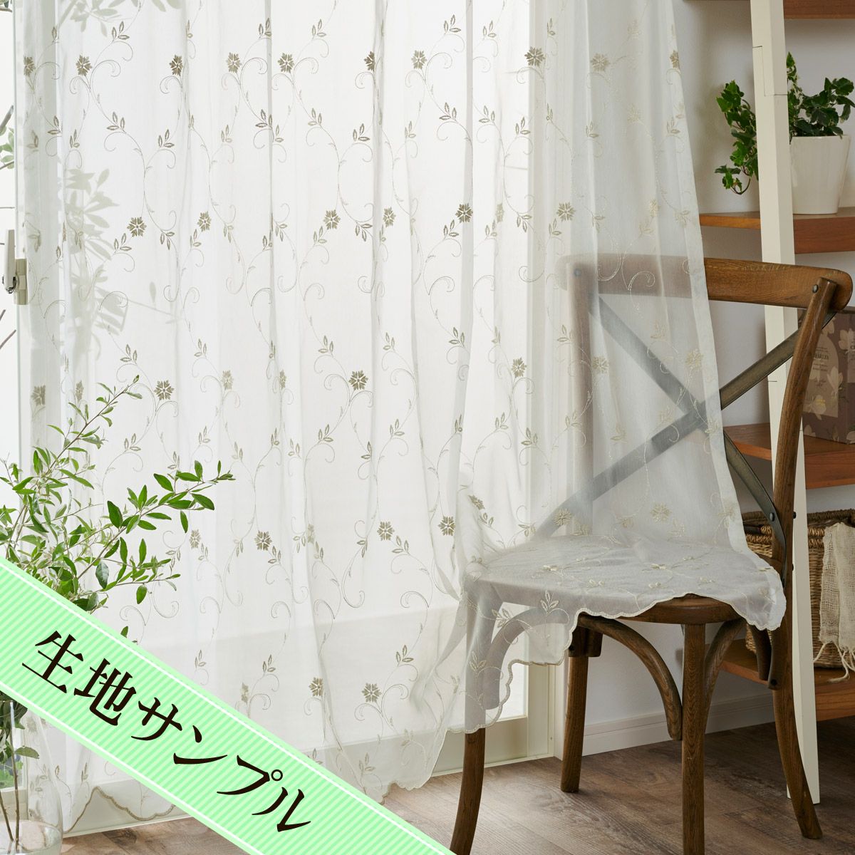 ナチュラルな風合いの草花や動物の刺繍がおしゃれなレースカーテン マーシャ(L-1296)