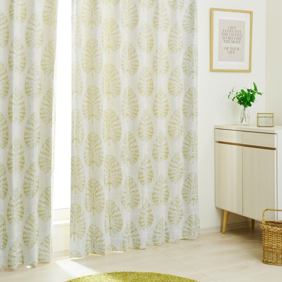 水彩タッチのリーフ柄に癒される完全1級遮光カーテン