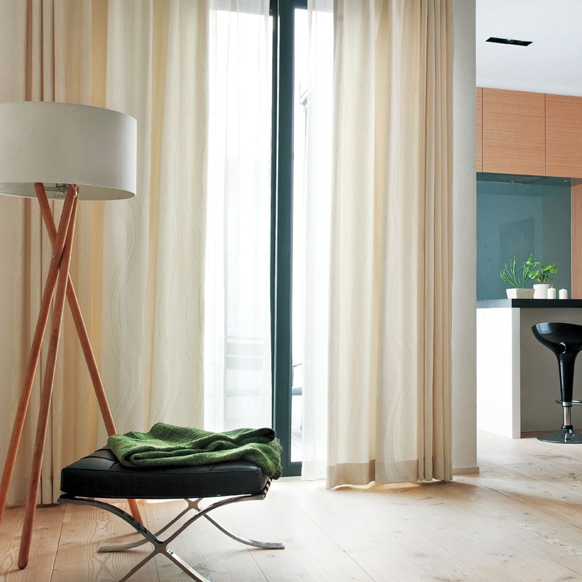 縦に流れるウェーブ柄と淡いカラーがおしゃれな防炎カーテン