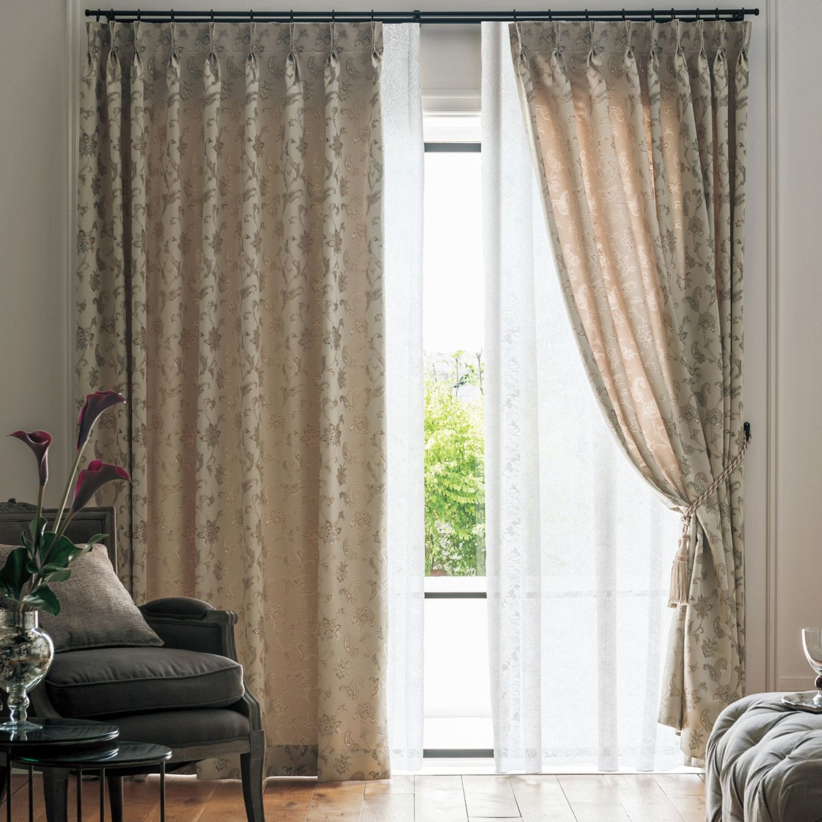 優雅で華やかなエレガントスタイルにふさわしいカーテン選びのポイントは、エレガントな雰囲気と相性のよい生地の中からお選びになることです。