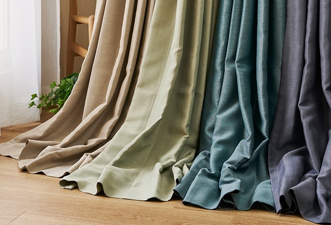 色ムラが節のようにランダムに表れてシャンタン(つむぎ)のように見え、遮光カーテンとは思えない高級感ある風合いも魅力です。