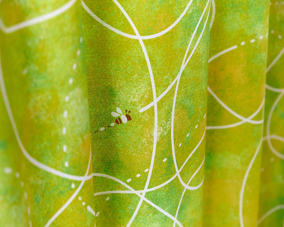 「ハニー」はミツバチの軌道を描いた伸びやかなラインと水彩調の柔らかなグラデーションが魅力の3級遮光カーテンです。
