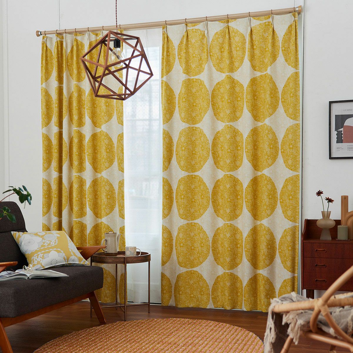 ナチュラルな雰囲気のサークル柄がおしゃれな3級遮光防炎カーテン