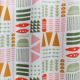 グリーンを中心に、ピンクや赤、オレンジなどさまざまな色で幾何柄のモチーフを表現した、カジュアルさのあるデザインです。