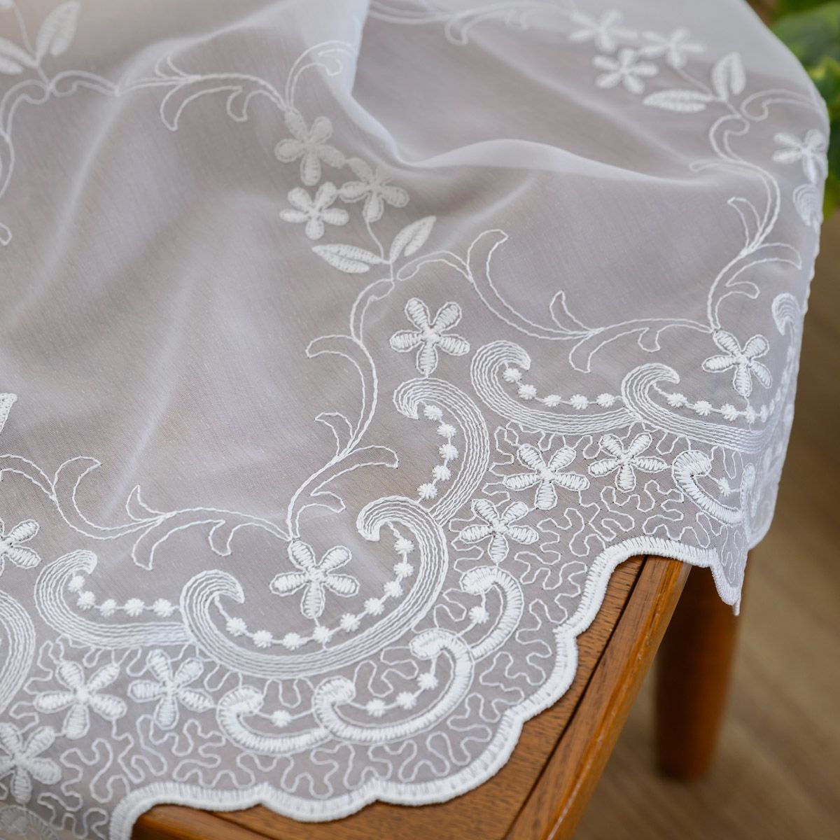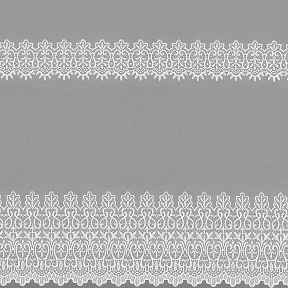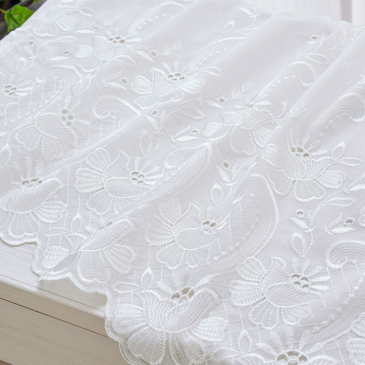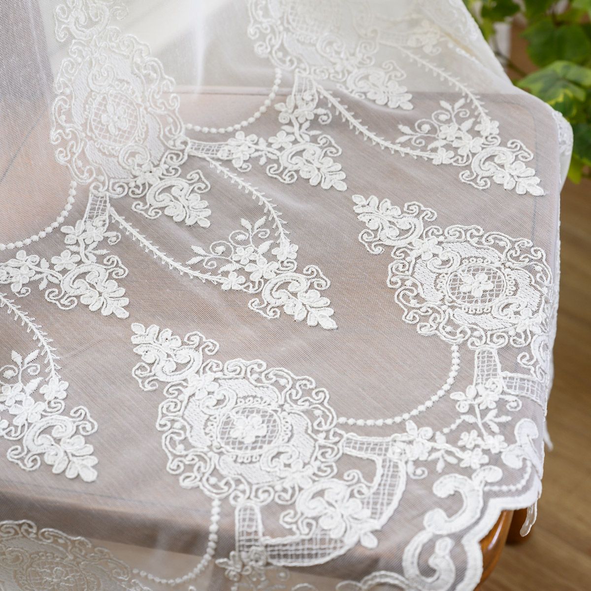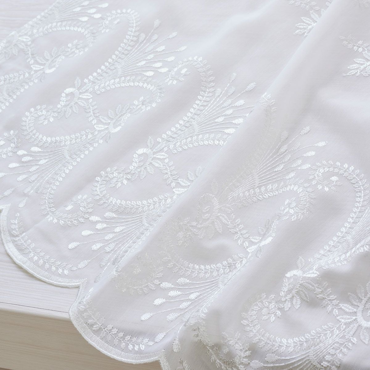 窓に吊るした際に横一列に連続してつながる繊細な刺繍や美しいデザイン。生地の継ぎ目がないため、大きな窓のレースカーテンの優雅さや魅力を最大限に引き立てます。