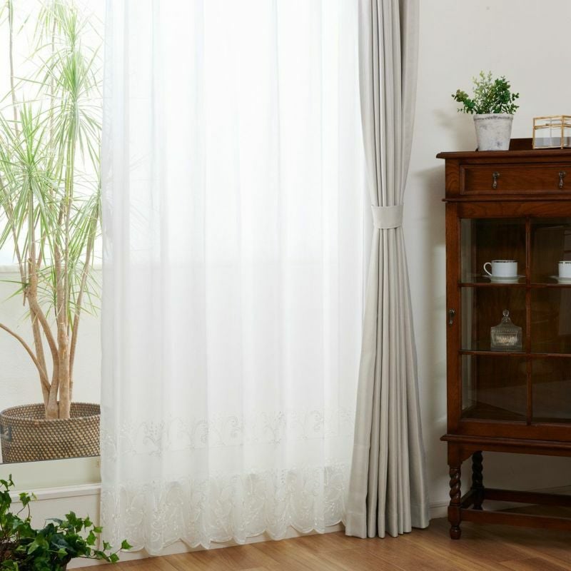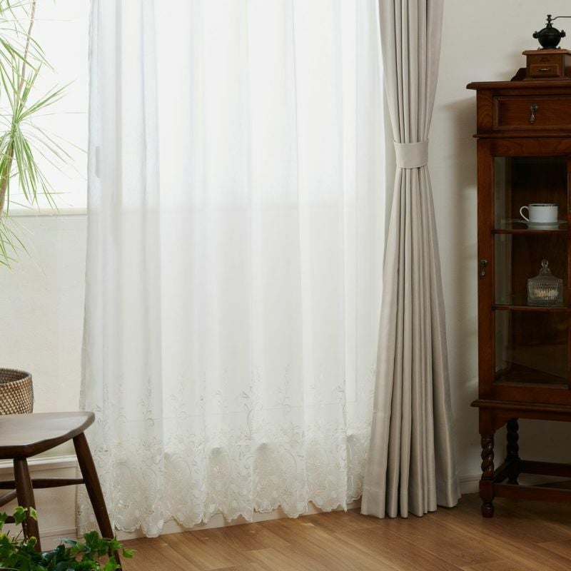 裾絵羽柄の豪華な刺繍が美しく、クラシカルにもフェミニンにも合わせやすいシームレスの刺繍レースカーテン。