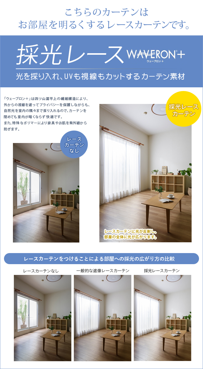 帝人フロンティア(株)の特殊繊維「ウェーブロンプラス®」を使用することにより、『透けにくさ』と『明るさ』の両方を叶えた採光レースカーテンです。