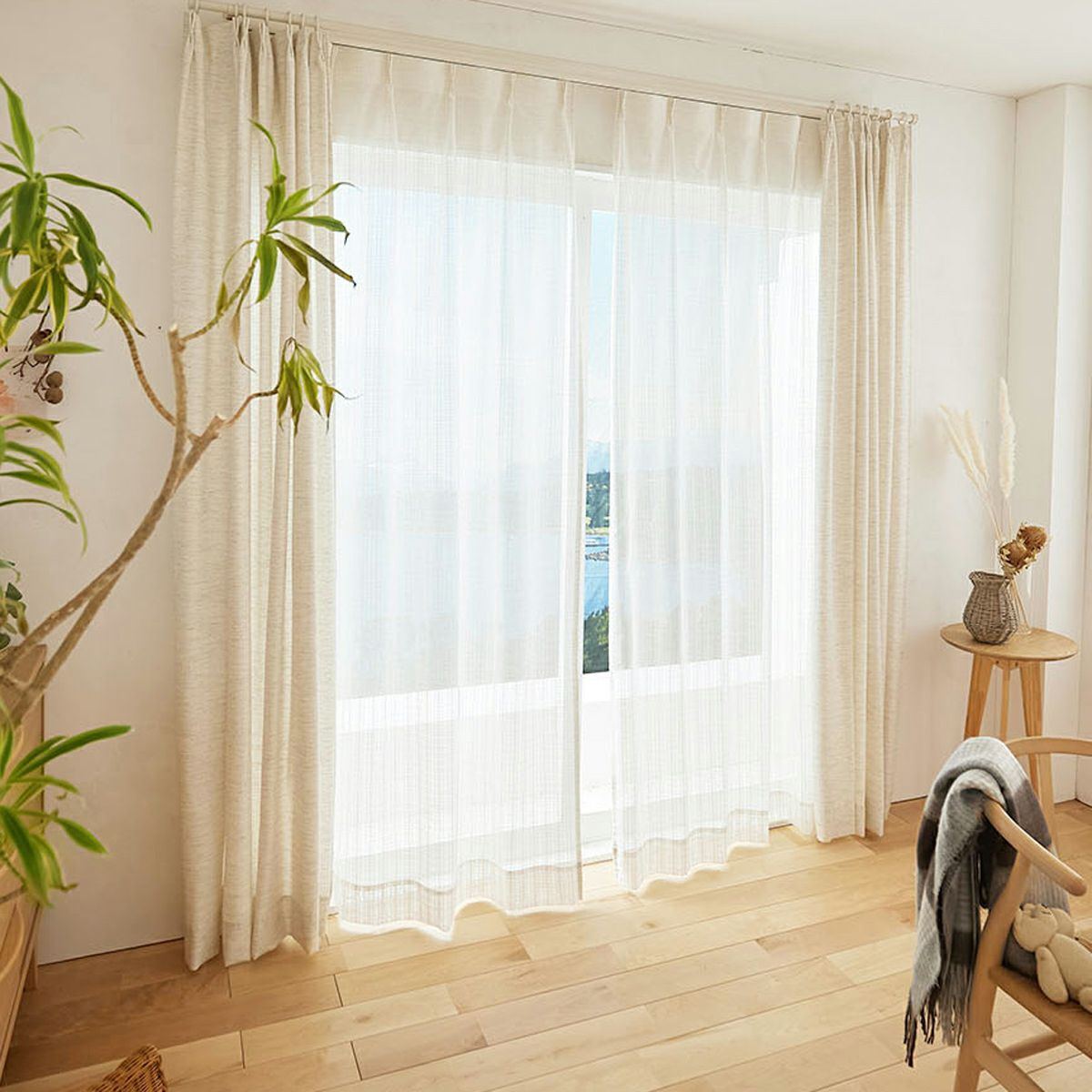 リネン85%ナチュラルなインテリアに合う大きな窓でも美しいシームレスレースカーテン