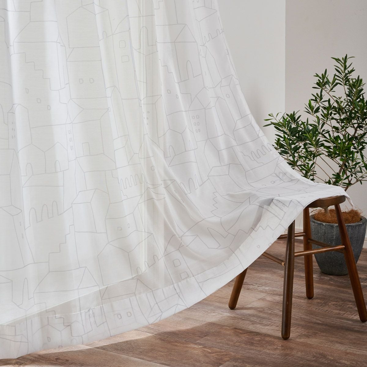 ガーゼのような柔らかいキルト生地にダマスク柄のステッチを施したシームレスカーテン