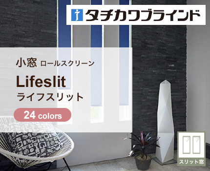 採光目的で設置されるタテに細長い小窓(スリット窓)は外から家の中が見えにくいといった特徴がありますが、安全のためには上下に開閉するロールスクリーンの併用がおすすめです。スリット窓は幅10cmから制作可能な商品のみの対応となりますので、こちらのカテゴリーかお選びください。