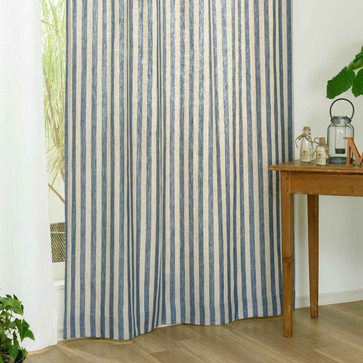 リネン100%の生地を使用した、ヴィンテージ感があふれるボーダーストライプのナチュラルドレープカーテンです。生地色は麻本来の自然なベージュ色であり、天然素材ならではの風合いがあります。