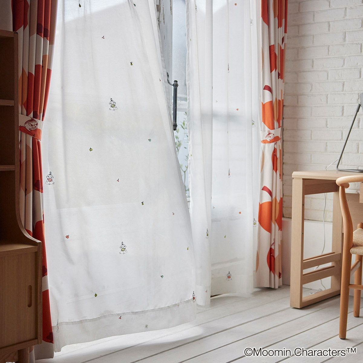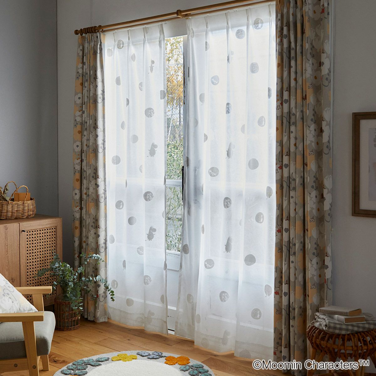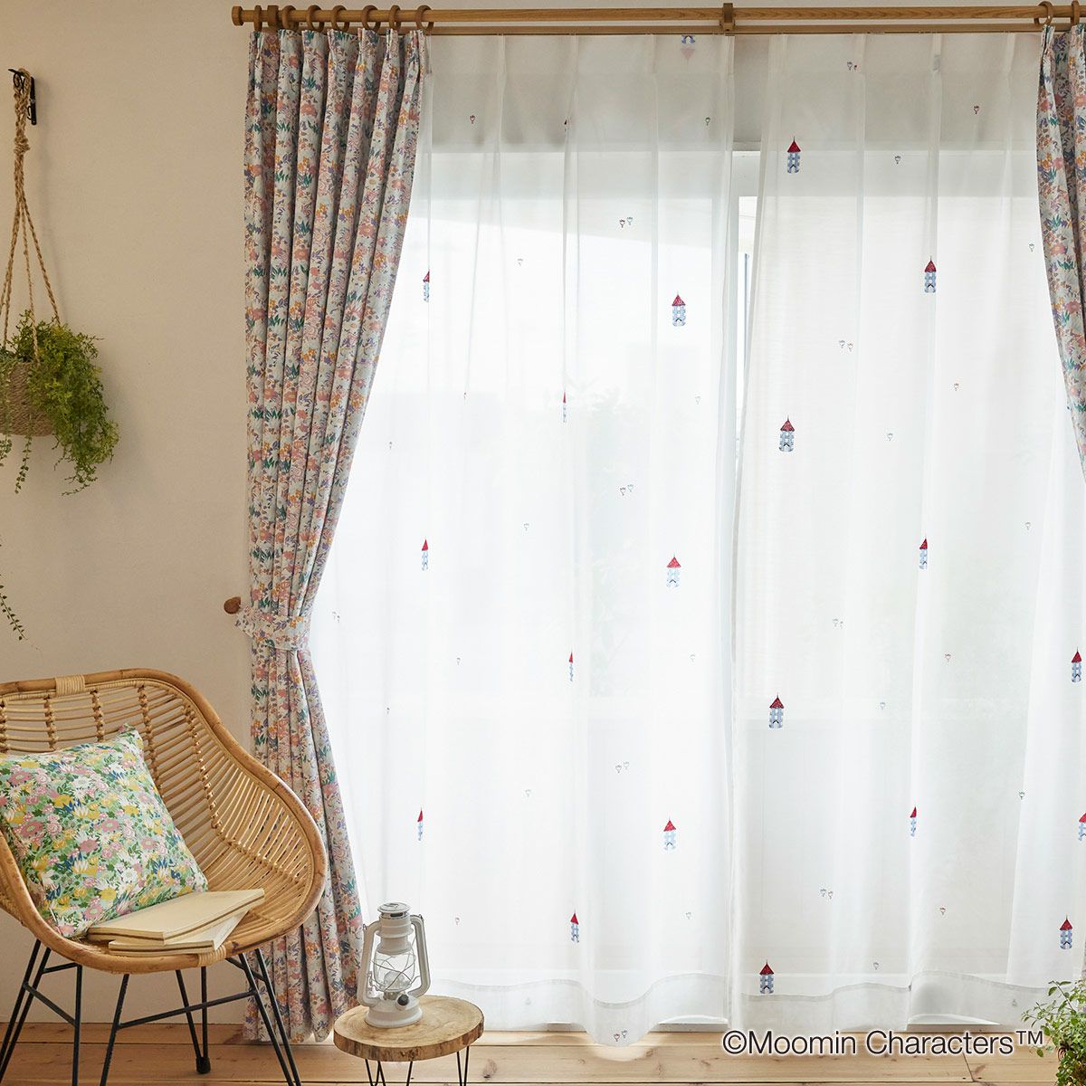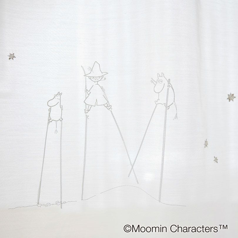 ムーミン谷の住人が集まり、のんびりと過ごす様子を描いた美しいボイルカーテンです。ムーミンに登場する人気のキャラクターたちが大集合。窓辺からムーミンの世界に誘います。