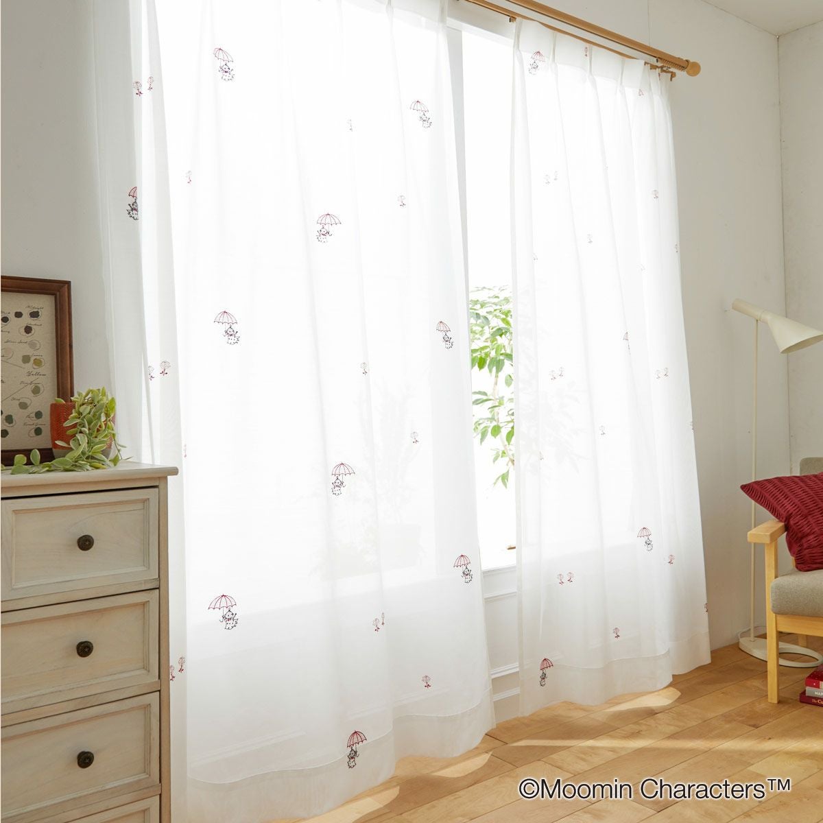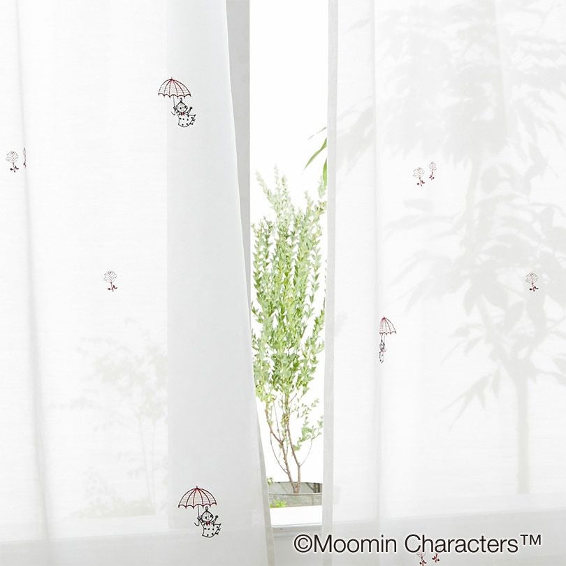 傘を持ってふわふわ漂う、ちびのミイを刺繍しました。ナチュラルで可愛らしい雰囲気のレースカーテンです。ご家庭でお手入れ簡単なウォッシャブルタイプです。