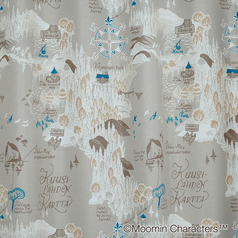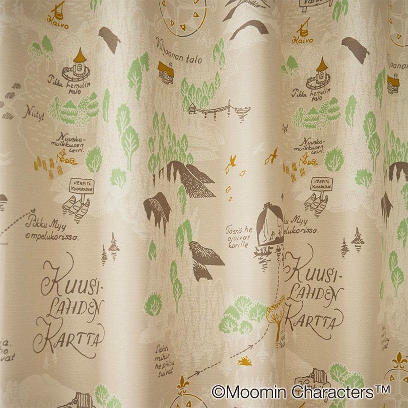 楽しいムーミン一家の姿にほのぼのする地図のデザイン。2級遮光カーテンでご自宅で洗えます。