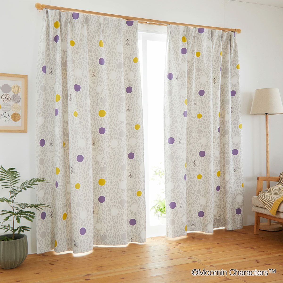 フルーツとお花のリースにムーミンとその仲間たちが細かく描かれた北欧デザインの遮光カーテンです。手描きタッチのデザインがムーミンならではの自然で優しい世界観を窓辺に演出してくれます。