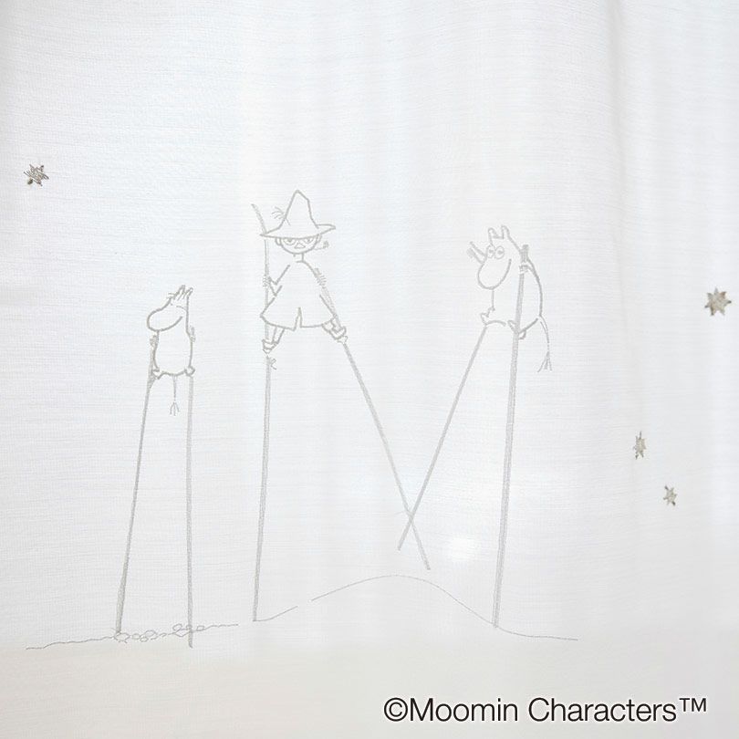 横並びの木々にムーミンと仲間たちがこっそり隠れているデザインです。お手入れ簡単なウォッシャブルタイプのレースカーテンです。