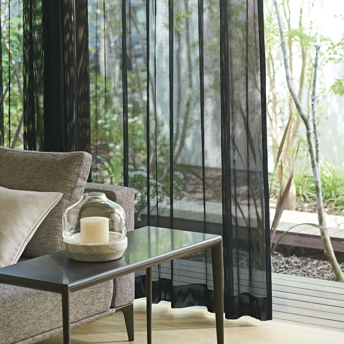 モダンな空間に洗練された印象を与える、ブラックのレースカーテンです。