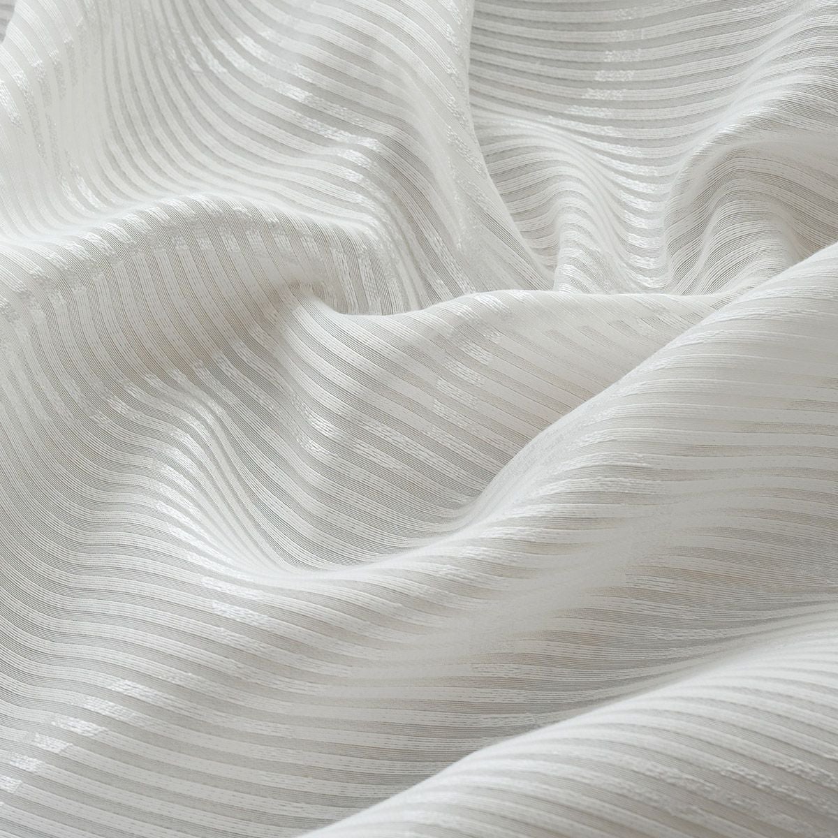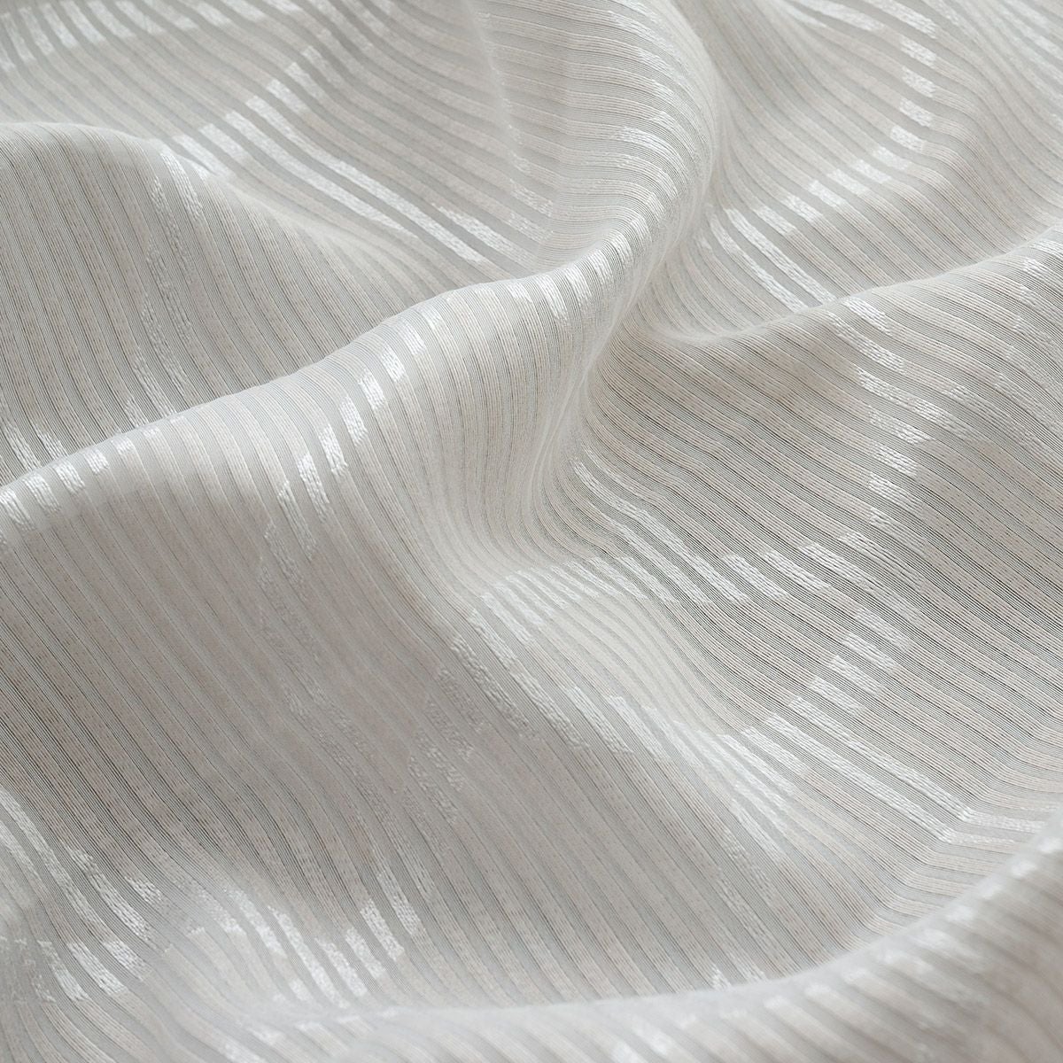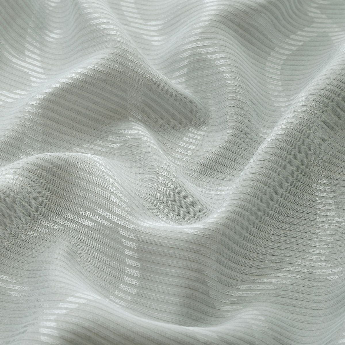 細かいボーダー柄の上に、上品な光沢糸で織り込まれた模様が美しく映える防炎レースカーテン。