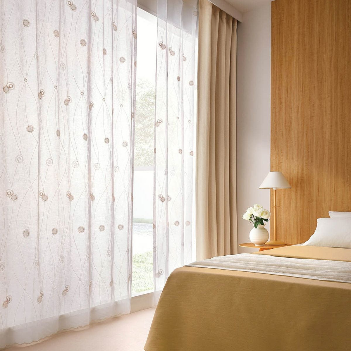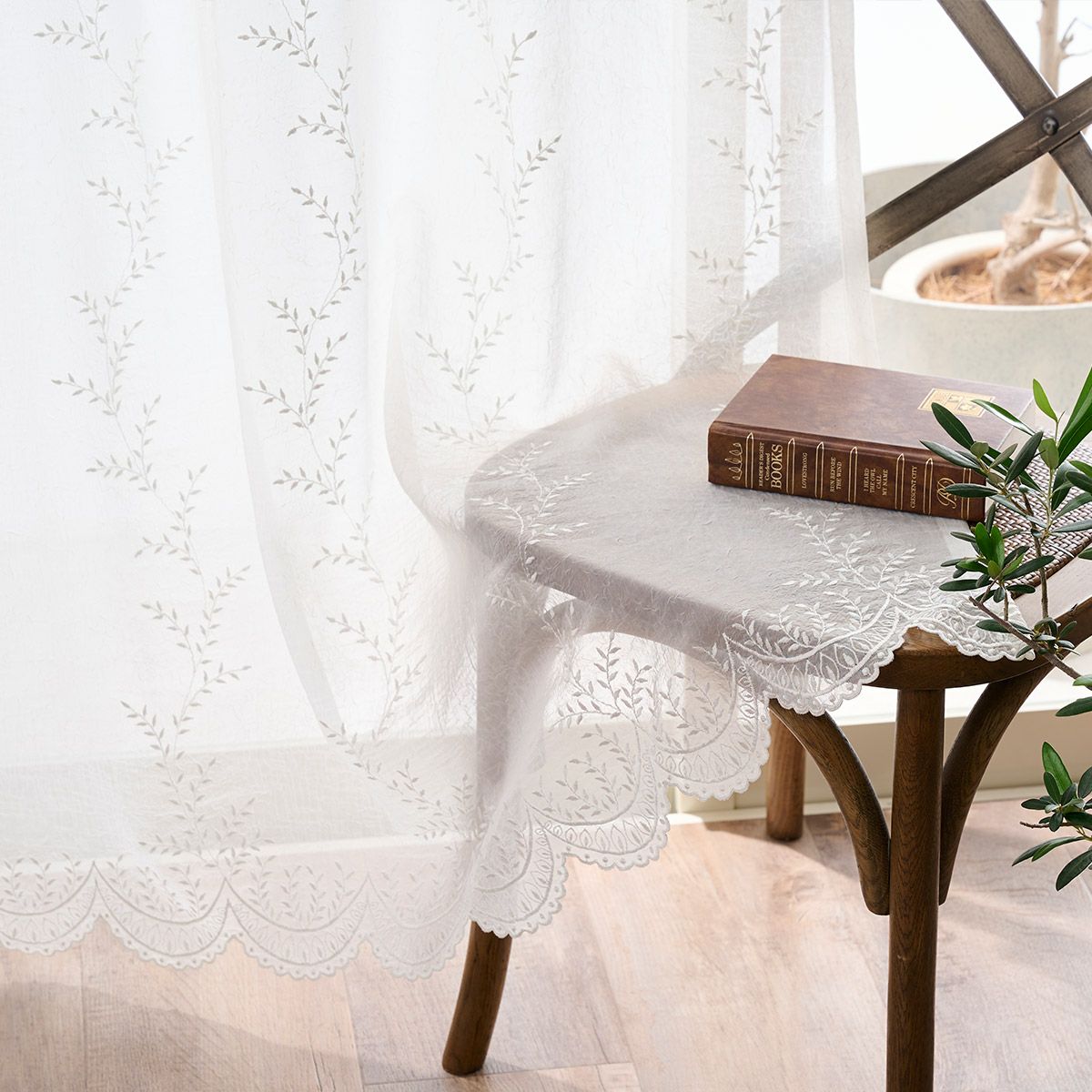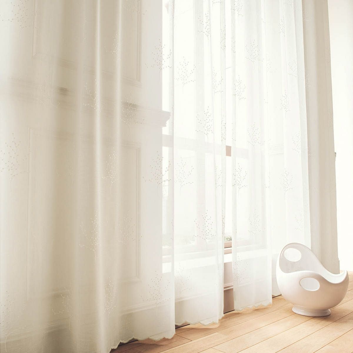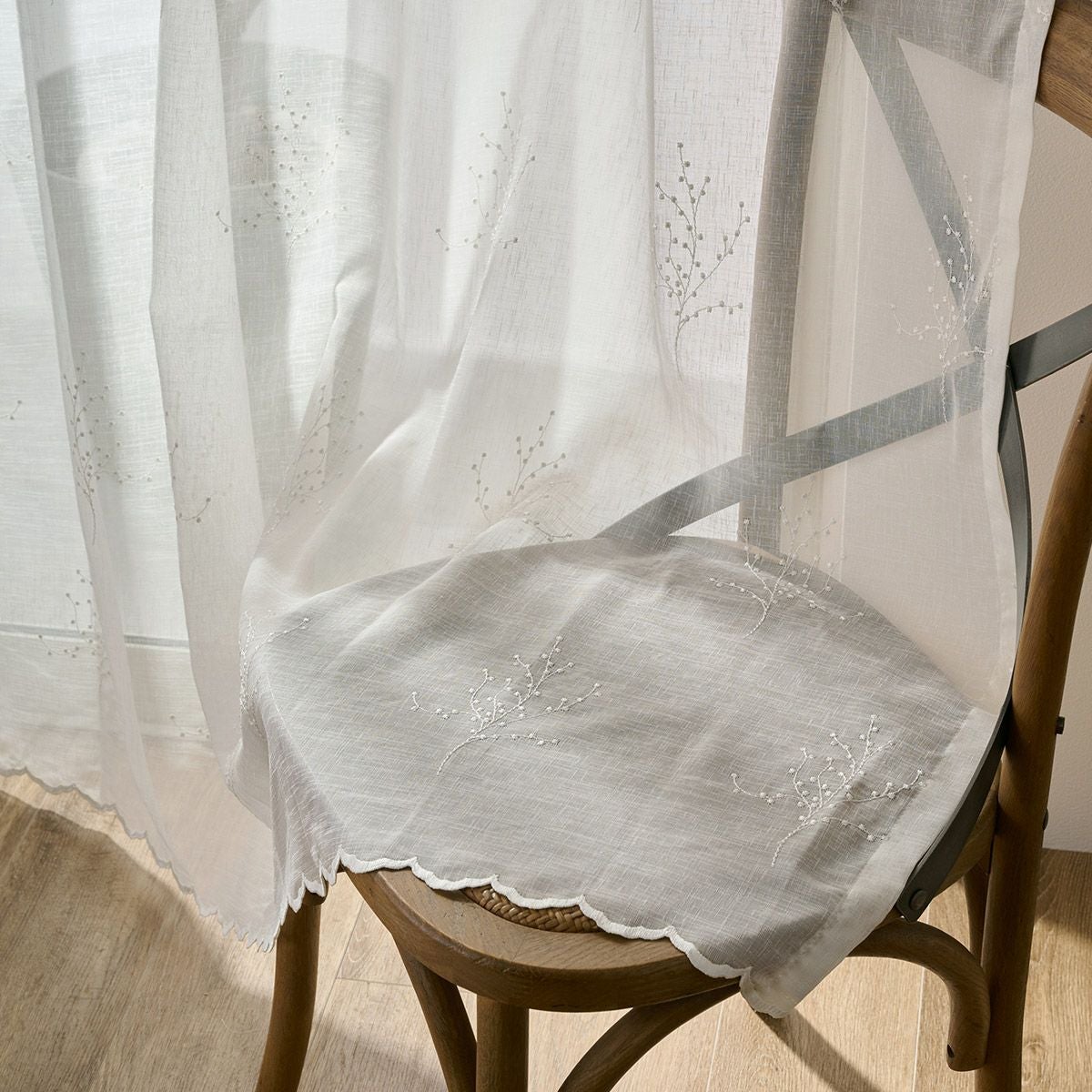 幅継ぎのないシームレス仕様で、美しい刺繍を隅々までお楽しみいただけます。窓辺に優雅さと洗練された雰囲気をもたらす逸品です。