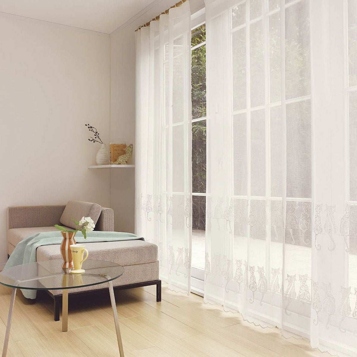 モダンでおしゃれな模様の猫の刺繍が、窓辺をさり気なく華やかに彩り、ほっと癒させる空間を演出してくれます。