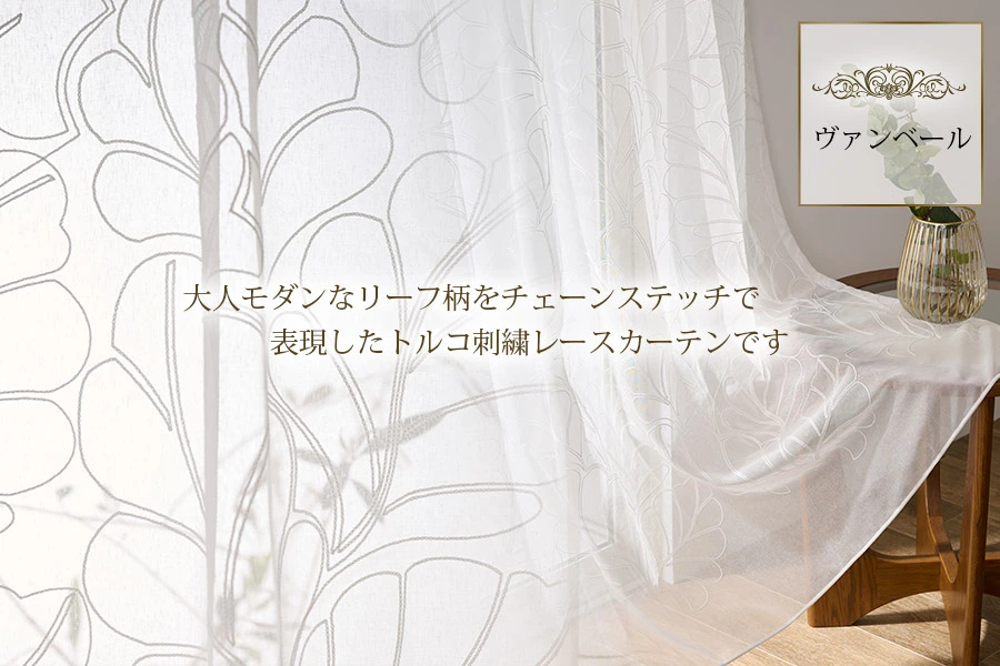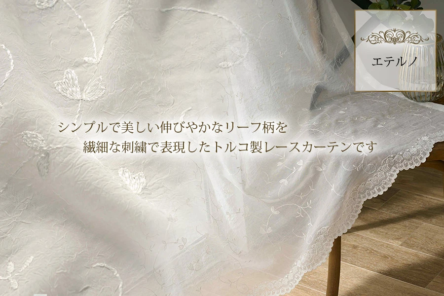 シンプルで美しい伸びやかなリーフ柄を繊細な刺繍で表現したトルコ製レースカーテンです。