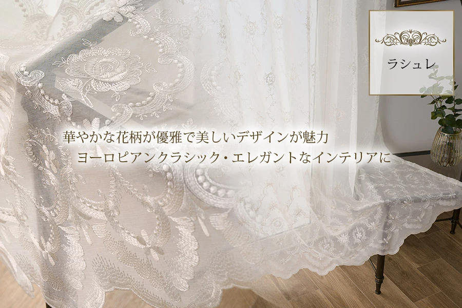 レースカーテンの裾がスカラップに縁取り刺繍されたクラシックなタイプや、スパンコールや金銀の糸を挿入したモダンなタイプまで、種類やデザインは様々です。