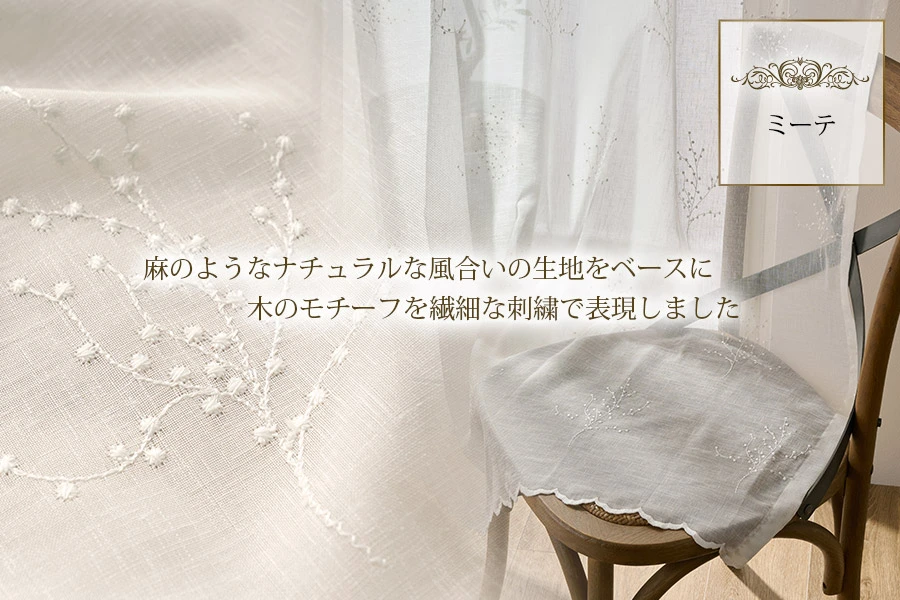 トルコ製の刺繍生地はヨーロッパ向けに生産されているためデザインが大変美しく、緻密かつ繊細な技術と感度の高さが織りなす高品質な刺繍が施されていることで有名です。透け感のあるボイル生地に繊細な刺繍が描き出すデザインのレースカーテンはお部屋を知的で上品な空間へグレードアップしてくれます。