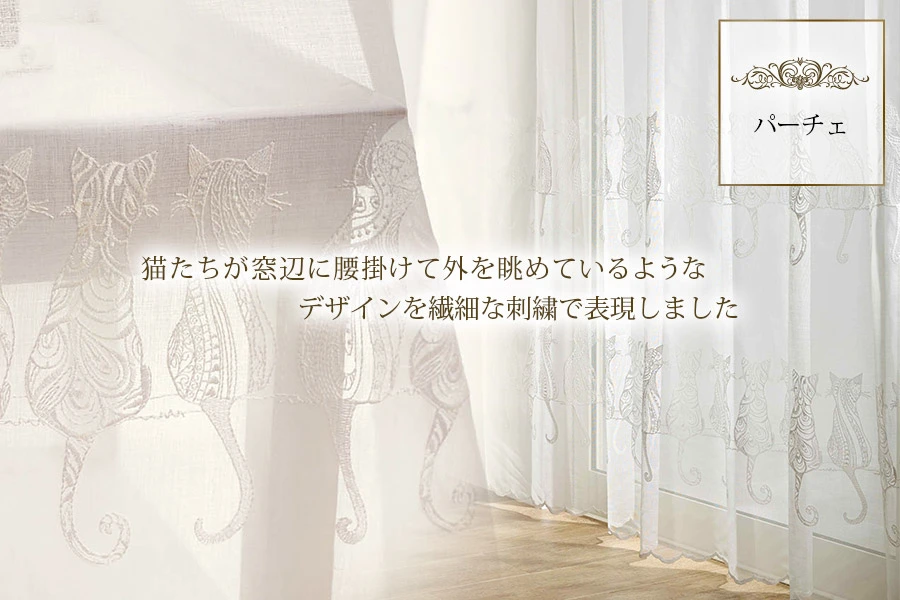 外を眺める猫たちを繊細な刺繍で表現したトルコ製レースカーテン パーチェ(L-8205)