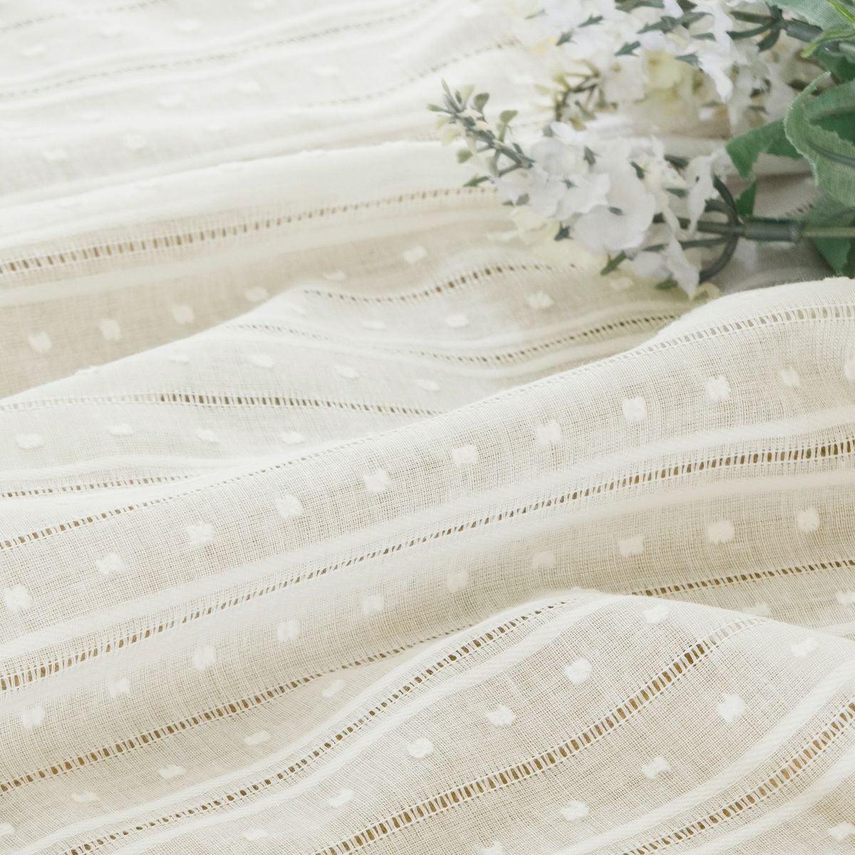 ガーゼのような柔らかいキルト生地にダマスク柄のステッチを施したシームレスカーテン