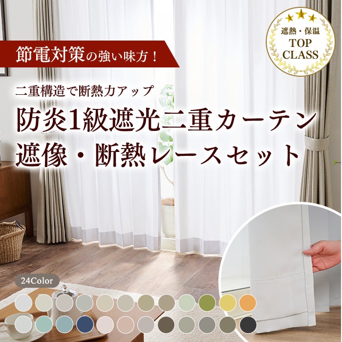 《set》24色 節電・省エネ対策におすすめ!防炎1級遮光二重カーテン 遮像・断熱レースセット(D-0114W)
