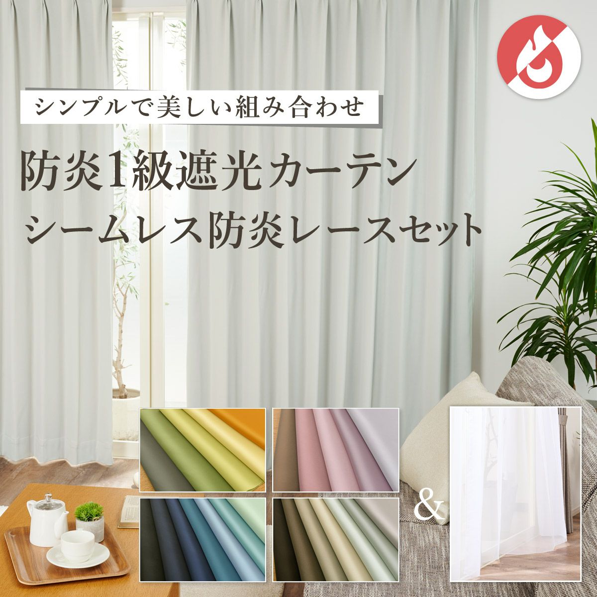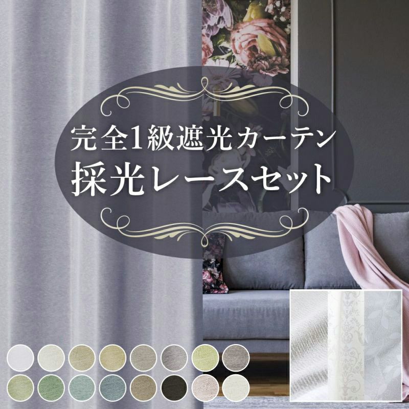 《set》シームレス防炎レース&24色防炎1級遮光カーテンセット(D-0114fin)