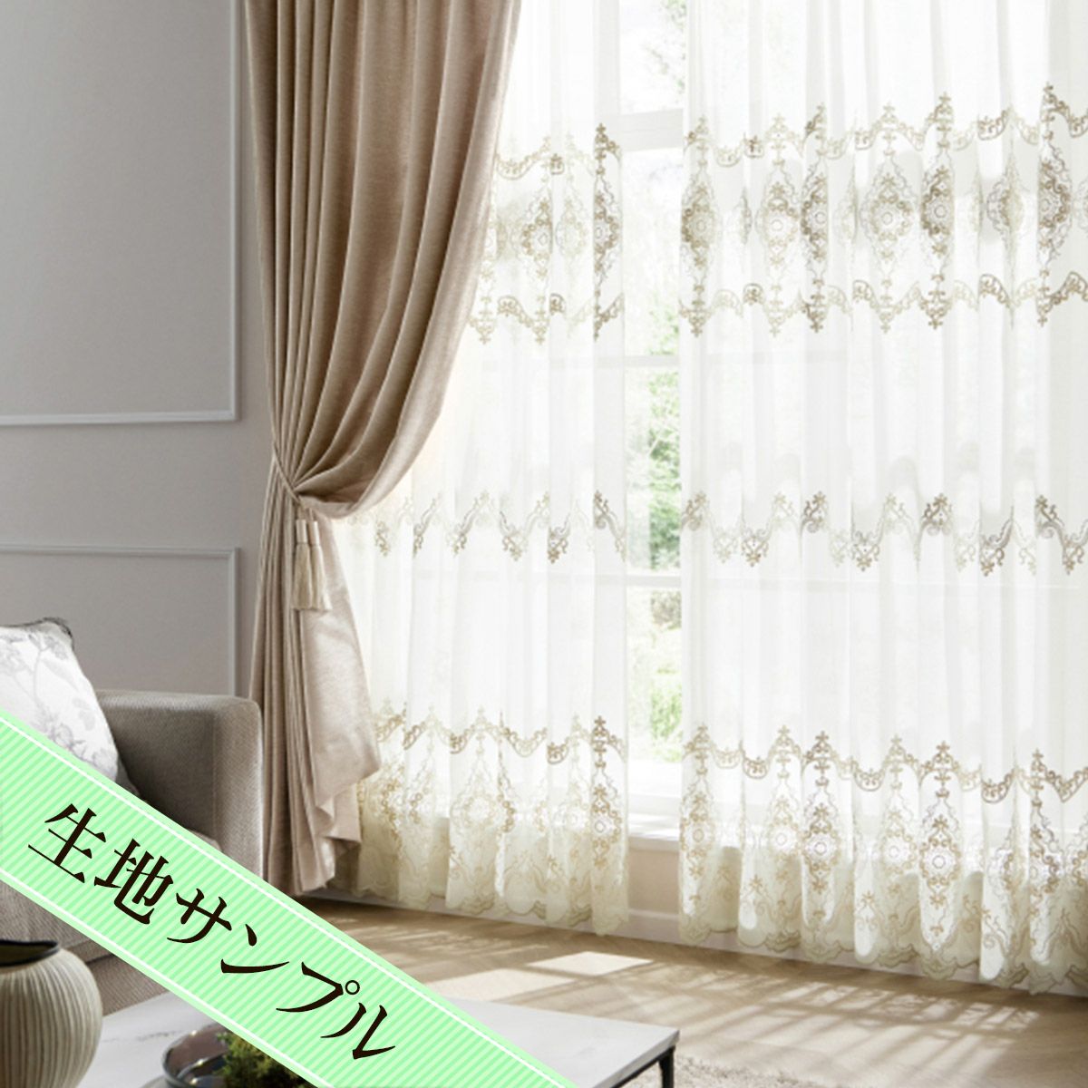 クラシカルで繊細なマクラメレースがエレガントなシームレストルコ刺繍カーテン プラシード(L-8204)生地サンプル