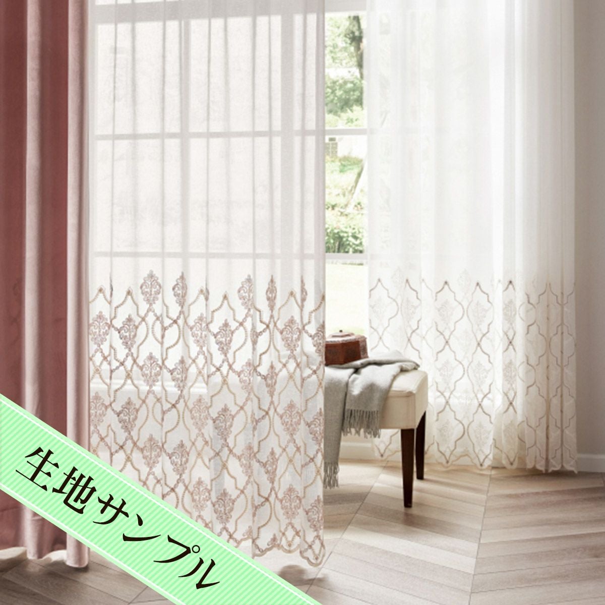 ピンクベージュの上品なコード刺繍と裾スカラップが美しいトルコ刺繍レースカーテン ビジュ(L-8204)生地サンプル