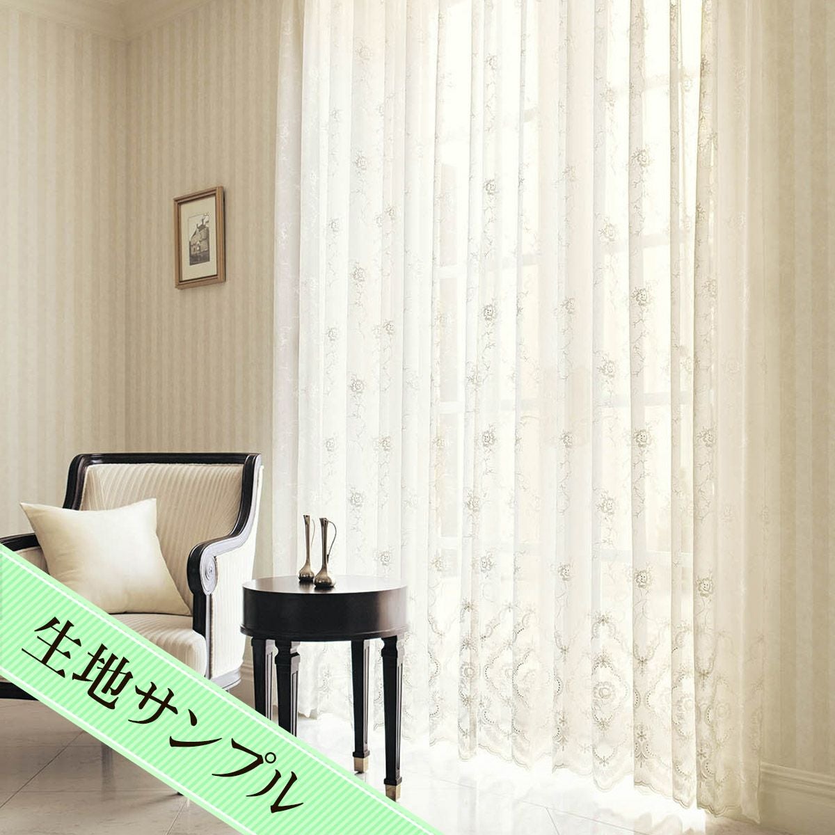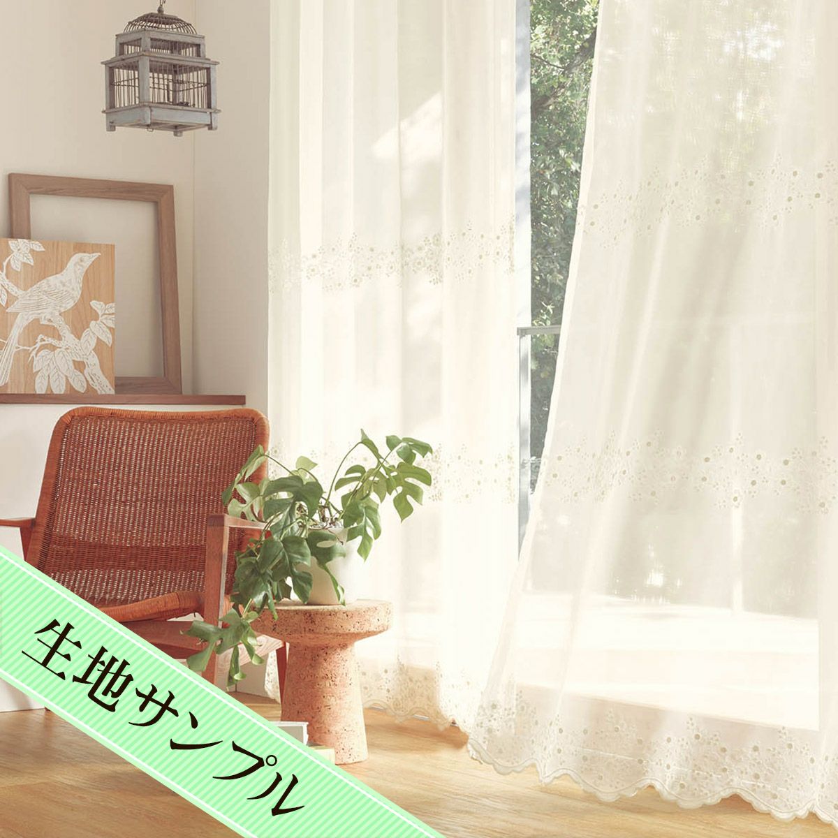 白とベージュの2色から選べる小花とつる唐草の刺繍が美しい裾スカラップのトルコ刺繍レースカーテン ラフィネ(L-8205)生地サンプル