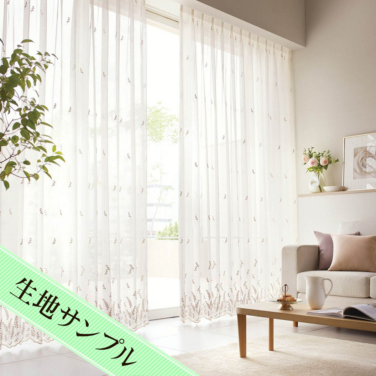 グレージュの小花刺繍がフェミニンでやさしい雰囲気のシームレストルコ刺繍レースカーテン シャルム(L-8205)生地サンプル