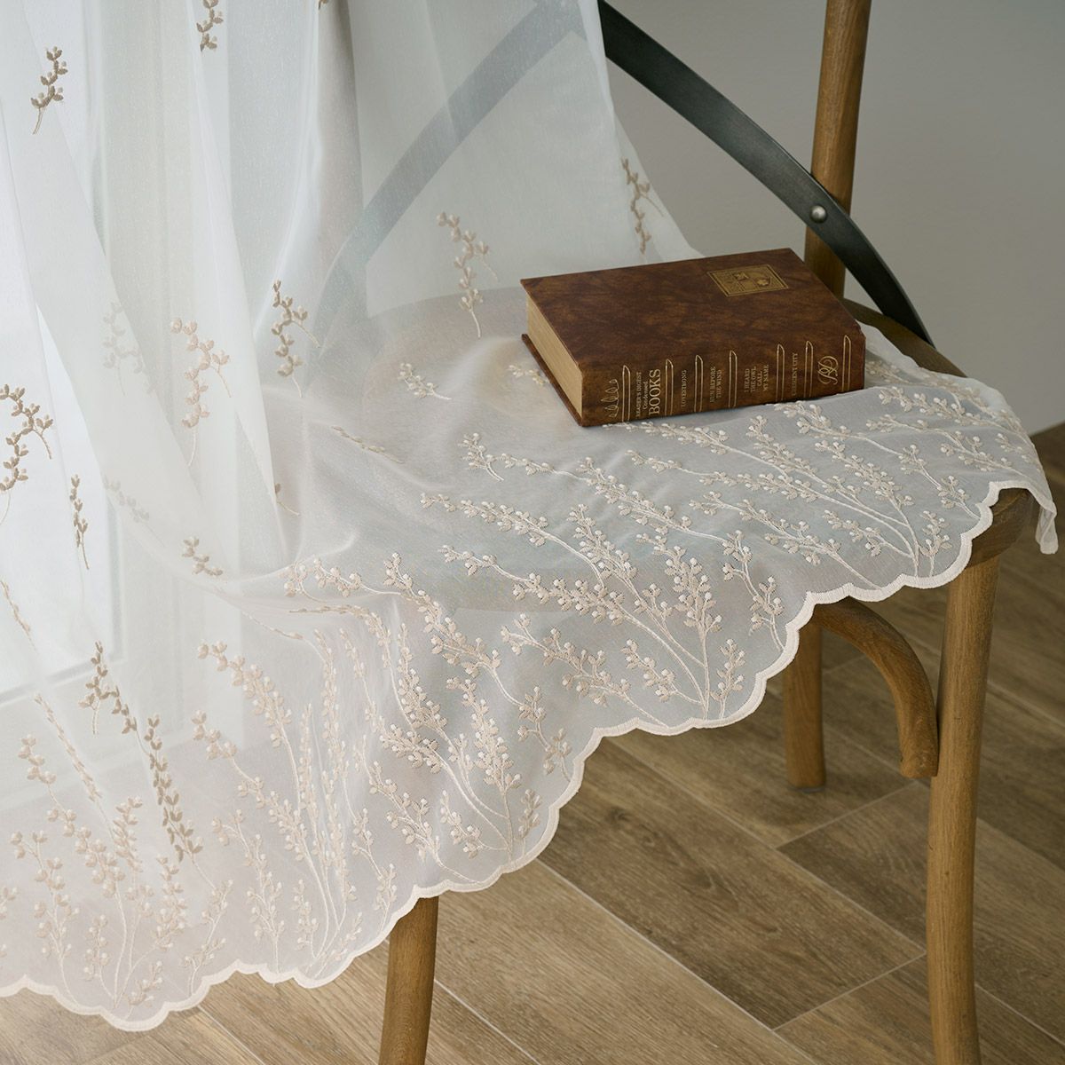 愛らしい花々の刺繍が美しい大人フェミニンで甘すぎない裾スカラップのトルコ刺繍レースカーテン アンジュ(L-8205)生地サンプル