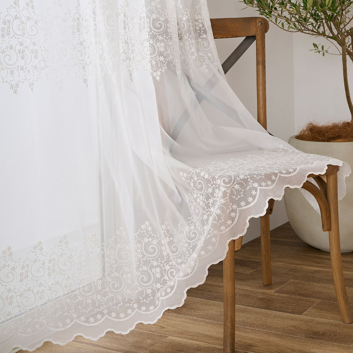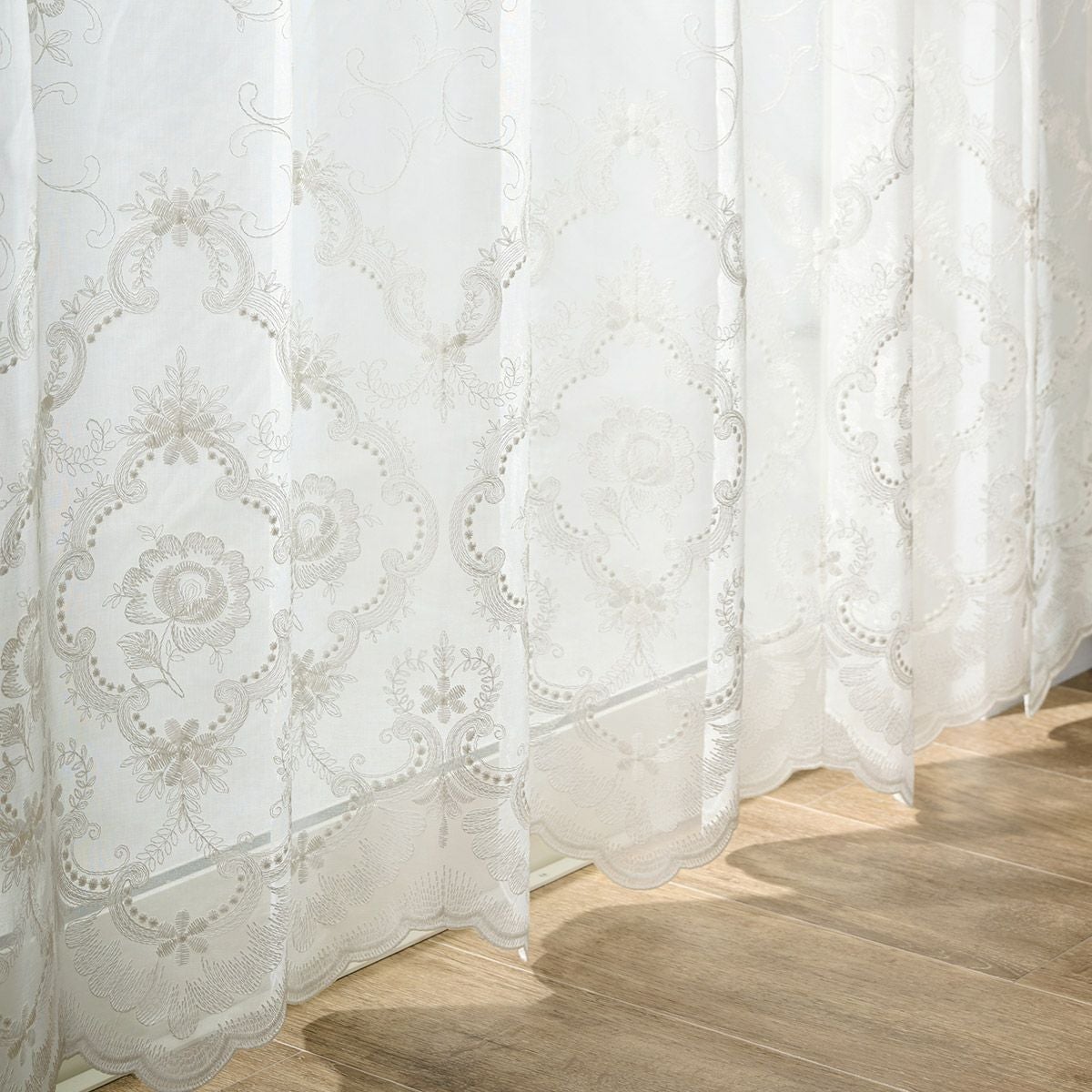 正統派の白花刺繍が圧巻の美しさ 裾スカラップ上品さを際立たせるトルコ刺繍レースカーテン ラシュレ(L-8205)生地サンプル