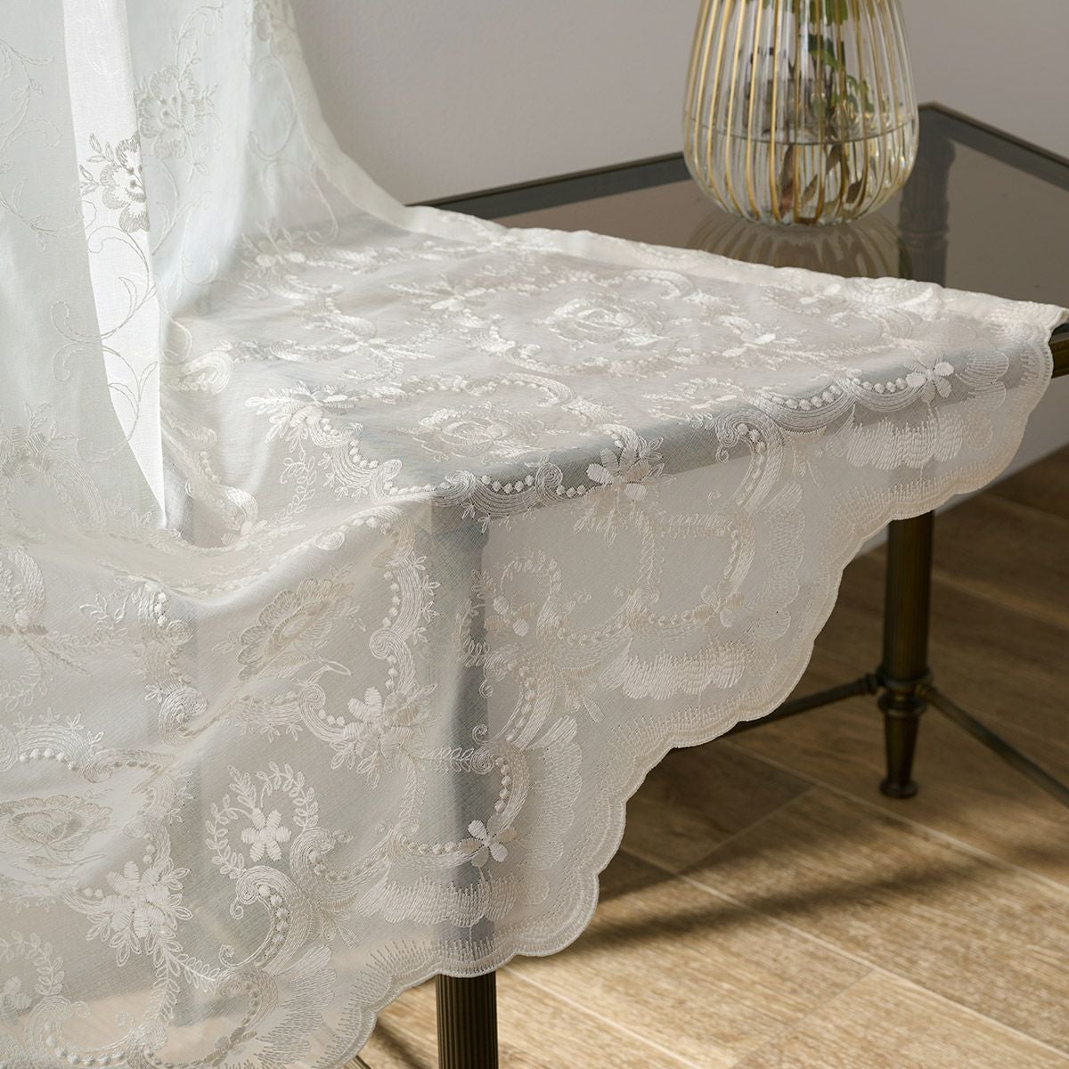 クラシカルなオーナメント&花ブーケの刺繍とスカラップが美しいシームレスのトルコ刺繍レースカーテン ミニョン(L-8205)生地サンプル