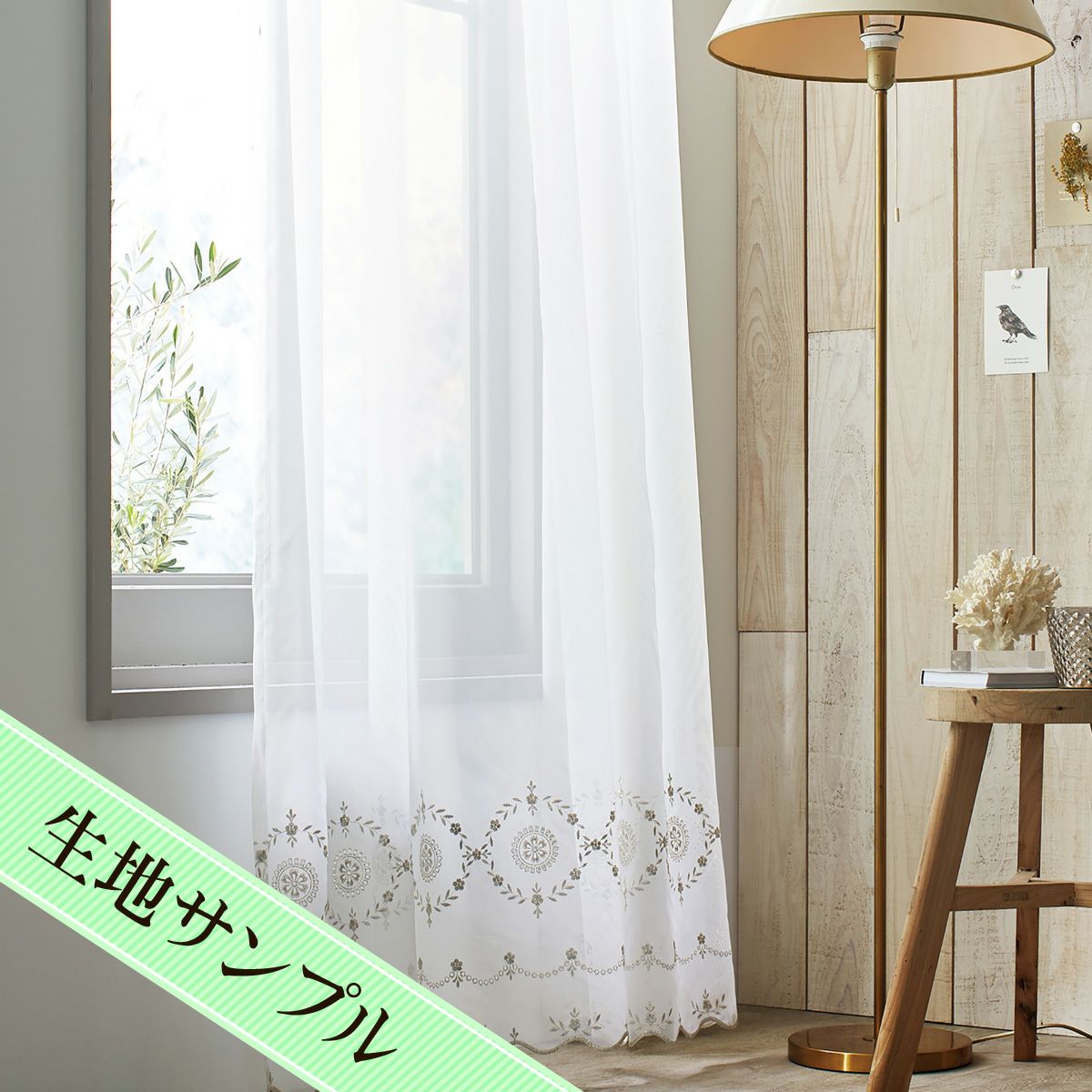 ナチュラルな風合いの草花や動物の刺繍がおしゃれなレースカーテン マーシャ(L-1296)