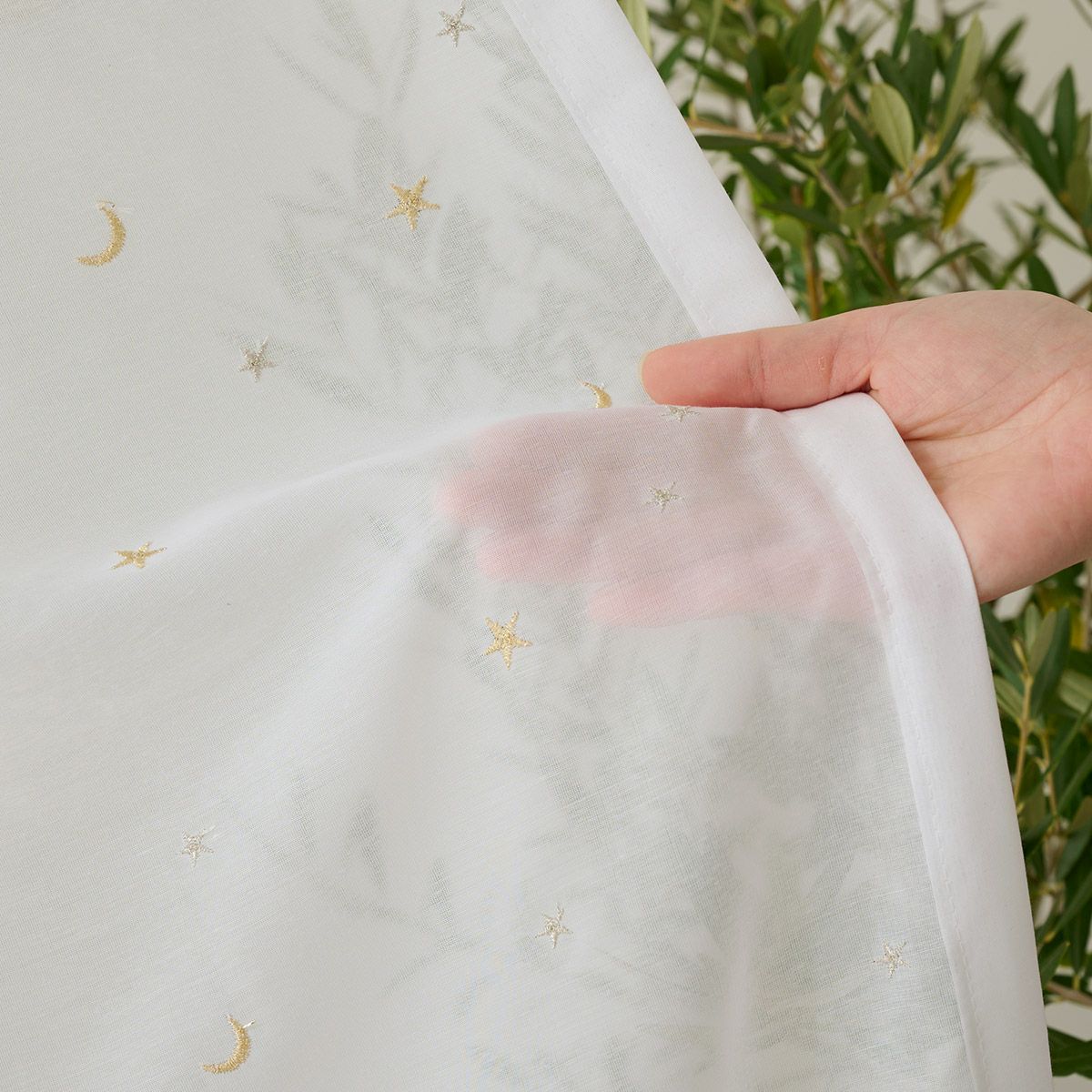 ガーゼのような柔らかいキルト生地にダマスク柄のステッチを施したシームレスカーテン